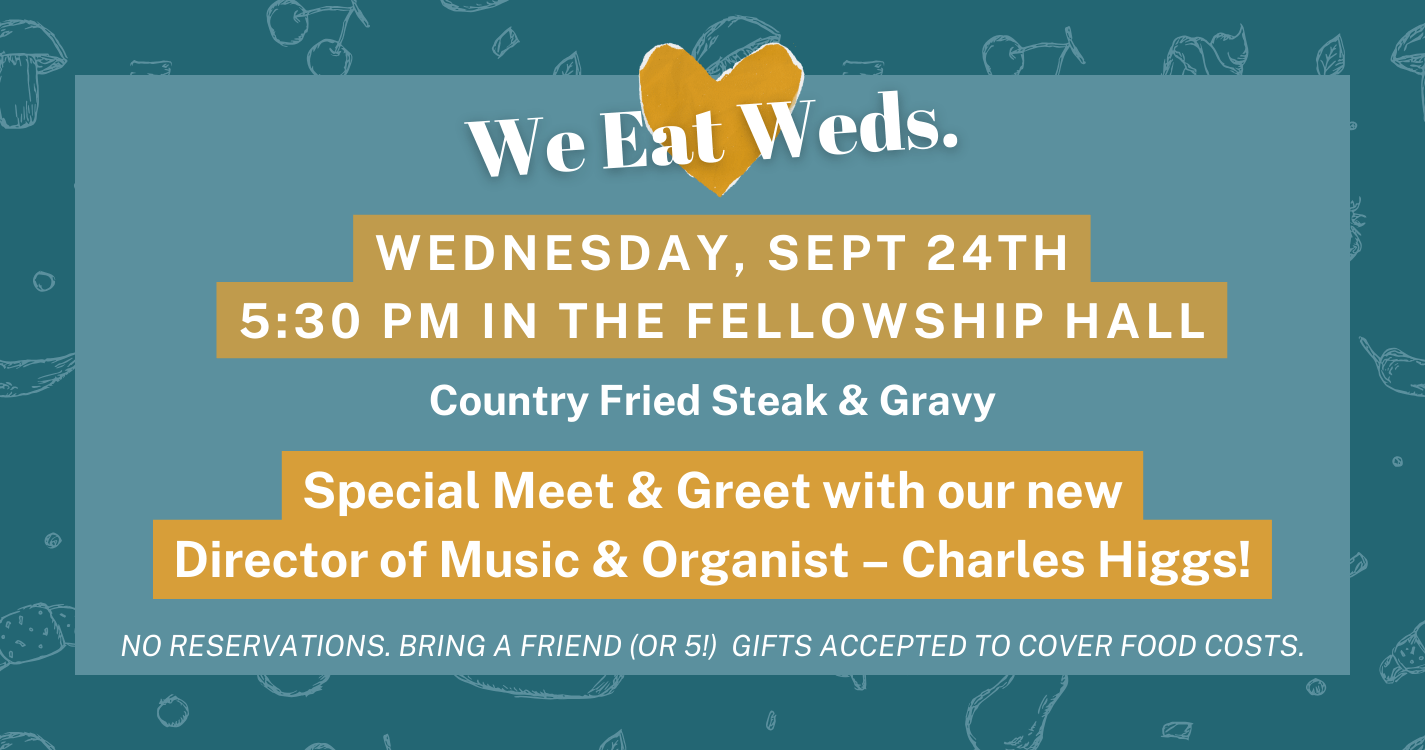 You'll want to be at the table on Wednesday, September 24! A hearty, southern-style Country-fried steak & gravy meal is on the menu. Once dinner's squared away, you'll get the chance to meet our new Director of Music & Organist -- Charles Higgs! --- Dinner is FREE for college students! Love offerings are accepted & […]